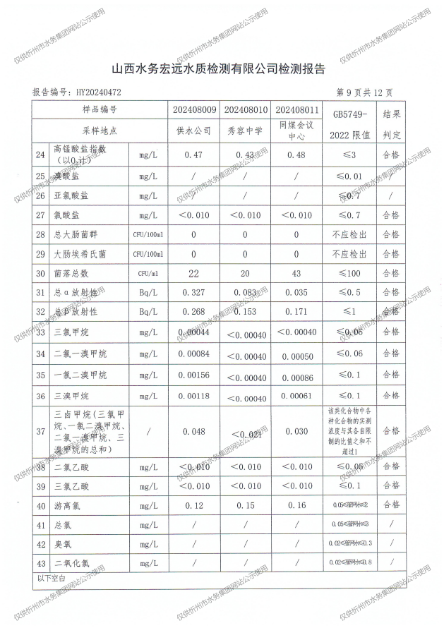 忻州城區(qū)公共供水水源水、出廠水、管網(wǎng)水、管網(wǎng)末梢水2024年8月份水質(zhì)信息公示